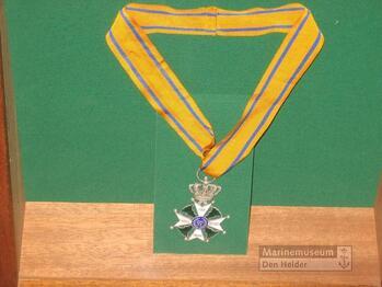 | omschrijving | Zilveren militaire Willemsorde 4e klasse van de Onderzeedienst. Het versiersel van de Militaire Willems-Orde is een wit geëmailleerd kruis, gedekt door een Koninklijke kroon. De vier omlijste armen van het kruis zijn van gelijke lengte, lopen van het midden breed uit, zijn aan het uiteinde ingekeept en voorzien van geparelde punten. De armen dragen aan voor- en achterzijde in gouden letters de woorden: "VOOR / MOED / BELEID / TROUW". Tussen de armen van dit kruis liggen die van een groen geëmailleerd 'Bourgondisch kruis'. In het hart van beide kruisen ligt aan de voorzijde een gouden 'vuurslag', aan de achterzijde een blauw geëmailleerd medaillon, in het midden waarvan een lauwerkrans, die de letter "W" omvat. Het lint is oranje met twee smalle Nassaus blauwe strepen. Ridder 4e klasse: De middellijn van het wit geëmailleerde kruis bedraagt 42 millimeter, die van het Bourgondisch kruis 36 millimeter: de omlijsting van eerstgenoemd kruis en van het medaillon, de geparelde punten, de lauwerkrans, de W en de kroon zijn van zilver; de breedte van het lint bedraagt 27 millimeter.