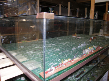 | omschrijving | Een maquette op de rivier. Aan de zuidwal/loswal het s.s. "Nieuw Amsterdam", 1 drijvende kraan + 1 vrachtboot (naamloos) + 1 coaster (naamloos) + loswal met 16 huisjes + 1 kerk + 1 kantoor + 2 kranen + lading (10 kisten + 5 vaten). Op de rivier: 1 vrachtschip (naamloos) gemeerd op 2 boeien, 2 duikboten + 1 oorlogsschip gesleept door marinesleepboot + 4 motorjachten + 1 binnenvaartschip + 1 visserman, dok "Martin 2" gesleept door 2 sleepboten, in het dok 1 containerschip . 1 lashboot, 1 vrachtschip, 1 booreiland gesleept door 1 sleepboot + supplyer. 1 vrachtschip, passagiersschip "Titanic" geassisteerd door 4 havensleepboten, 1 vrachtschip, 1 bevoorradingsschip marine gesleept door 1 sleepboot + 2 achtersleepboten, 1 vrachtschip, 1 passagiersschip, 1 sleepboot + 2 bakken, nogmaals 1 sleepboot + 2 bakken. Noordwal (loswal): 3 loodsen + 1 kantoorponton.