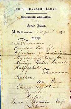 | omschrijving | Menukaart voor het eerste klasse diner op het s.s. "Zeeland" van de Rotterdamsche Lloyd. De menukaart is gemaakt van crèmekleurig karton, formaat A-5. De randen zijn versierd met een reliëf. De gedrukte tekst luidt: ""Rotterdamsche Lloyd. stoomschip Zeeland. Eerste Klasse. MENU van den .....188.. DINER." Met een kroontjespen is met de hand de datum ingevuld, 3 april 1890, en ook de verschillende gangen/gerechten zijn met de hand geschreven. Op de achterzijde van de menukaart staan de wijnen, likeuren, bieren en waters vermeld met prijslijst. Aan de voorzijde linksboven staat met potlood geschreven "Kapt. Kromwijk" en "Hofmeester P. Boot".