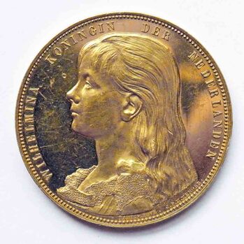 omschrijving | Voorzijde: portret naar links gewend van H.M. de Koningin Wilhelmina met loshangend haar. Randschrift in parelrand 'Wilhelmina Koningin der Nederlanden'. Rechtsonder 'Bart van Hove' (medailleur) en 'J.P.M. Menger' (ontwerper). Keerzijde: ovaal vlak veld in gekroonde lijst met leeuwenkoppen omgeven door twee lauwertakken, daaronder: W.S(chammer, medailleur), in parelrand. In het medaillon is de tekst ' Visscherijtentoonstelling 1892, collectieve inzending Vlaardingen' gegraveerd. Beschrijving uit lit. Zwierzina (deel 3, pag. 37) . De genoemde personen waren werkzaam (ca. 1892) bij de Rijksmunt te Utrecht. In de rand is een goudmerk voorstellende 'manspersoon' ingeslagen.