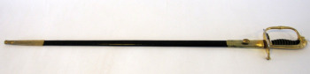 omschrijving | Een muzikantendegen M1875. Een degen met een lange, rechte kling met daarin geëtst florale en geometrische motieven. De greepkap, de voorbeugel en de stootplaat zijn vervaardigd van messing. Op de bovenzijde van de stootplaat een gekroond onklaar anker in wit metaal. De greep van zwart materiaal is spiraalsgewijs omwikkeld met metaaldraad. De bovenzijde van de greepkap vormt een leeuwenkop. De degen steekt in een bijbehorende zwart lederen schede. Aan de onderzijde van de stootplaat is een blauw etiket bevestigd met de aanduiding "22. Loff", om aan te geven dat dit wapen behoorde tot de bewapening van een muzikant.