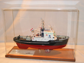 | titel | volmodel in vitrine, zwarte romp met witte band, rood onderwaterschip, witte opbouw, 2 blauwe rookkanalen met witte band waarop NRS embleem, grijze mast, zwart dek, 2 voith schneider propellers