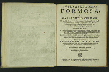 | titel | 't Verwaerloosde Formosa, of waerachtig verhael, Hoedanigh door verwaerloosinge der Nederlanders in Oost-Indien, het Eylant Formosa, van den Chinesen Mandorijn, ende Zeeroover Coxinja, overrompelt, vermeestert, ende ontweldight is geworden. Begrepen in twee Deelen: I. Verhandelende den Aert en Eygenschap deze Eylants, en Discipline des selfs Inwoonders. Der Chinezen toelegh en Oorlogs-preparatien, om het Eylant Formosa t'overvallen, ende der Nederlanders onachtzame, geringe en zwacke voorsorge tot hun tegenweer. II. Dan der Chinesen vyantlijcke overkomste op het Eylant Formosa; Hare belegeringh des Casteels Zeelandia, ende vordere Oorlogs-exploiten en de actien, gedurende deselve belegeringh ten wederzijden voorgevallen. Hier zyn by-gevoeght eenige aenmerckelyke saken, Rakende d'oprechte gront der Sinese Wreetheyt en Tyranny, gepleeght aen de Predicanten, Schoolmeesters ende Nederlanders aldaer. Met by-gevoeghde Authentijcke Bewijsen