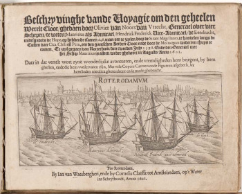 | titel | Beschryvinghe vande Voyagie om den geheelen Werelt Cloot, ghedaen door Olivier van Noort van Utrecht, Generael over vier Schepen, te weten: Mauritius als Admirael, Hendrick Fredrick Vice-Admirael, de Eendracht, midtsgaders de Hope, op hebbende tsamen 248.man, om te zeylen door de Strate Magellanes, te handelen langhs de Custen van Cica, Chili en Peru, om den gantschen Aerden Cloot, ende door de Molucques wederom thuys te comen. Te zeyl gegaen van Rotterdam, den tweeden July 1598.Ende den Generael met het Schip Mauritius is alleen weder ghekeert in Augusto, Anno 1601. Daer in dat vertelt wort zyne wonderlijcke avontueren, ende Vremdigheden hem bejegent, by hem ghesiien, ende die hem wedervaren zijn, Met vele Copere Caerten ende Figueren afgebeelt, by hemlieden nieulicx gheteeckent ende mede ghebracht.