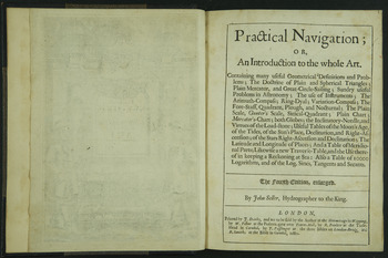 | titel | Practical Navigation or, an Introduction to the Whole Art. Containing many useful Geometrical Definitions and Problems; The Doctrine of Plain and Spherical Triangles; Plain Mercator, and Great-Circle-Sailing; Sundry useful Problems in Astronomy; The use of Instruments; The Azimuth-Compass; Ring-Dial; Variation-Compass; The Fore-Staff, Quadrant, Plough, and Nocturnal; The Plain Scale, Gunter's Scale, Sinical Quadrant; Plain-Chart; Mercator's Chart; both Globes; the Inclinatory-Needle, and Virtues of the Load-stone; Useful Tables of the Moon's Age, of the Tides, of the Sun's Place, Declination, and Right-Assension; of the Stars Right-Ascension and Declination; the Latitude and Longitude of Places; And a Table of Meridional Parts; Likewise a new Traverse-Table, and the Use thereof in keeping a Reckoning at Sea: Also a Table of I0000 Logarithms, and of the Log. Sines, Tangents and Secants. The Fourth Edition, enlarged